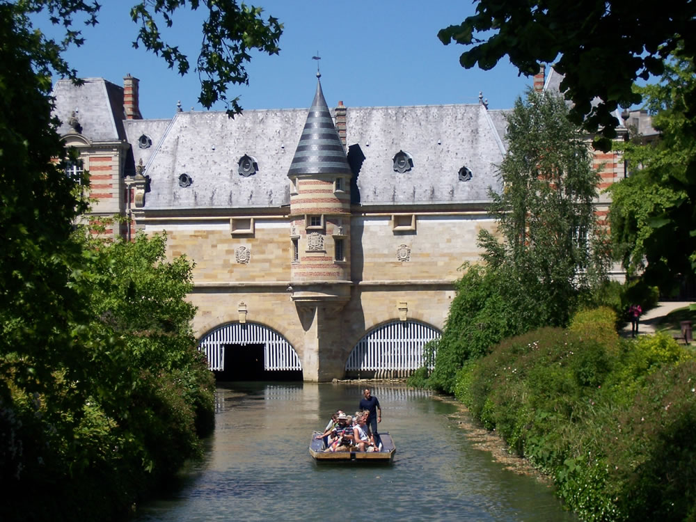 Eine romantische Sparzierfahrt auf dem Kanal in einer Bark. Im Hintergrund zu sehen das Château du Marché im Châlons-en-Champagne