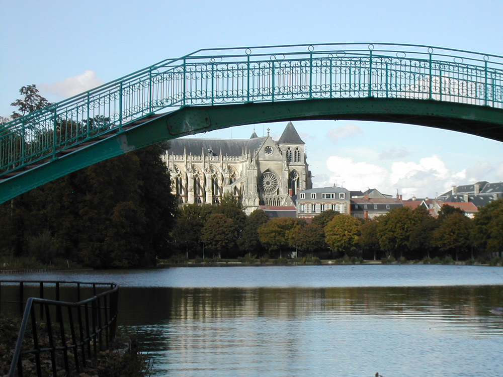 Ein schöner Ort zum entspannen, vor einer Fußgängerbrücke mit Blick über den Grand Jard auf die Kathedrale im Châlons-en-Champagne
