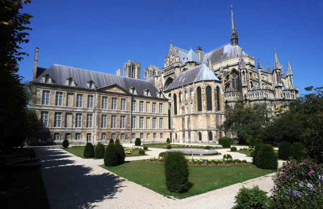 Schöne angelegte Gärten auf der Rückseite von Notre-Dame de Reims. Einen Besuch ist die Kathedrale von Reims auf jeden Fall wert.