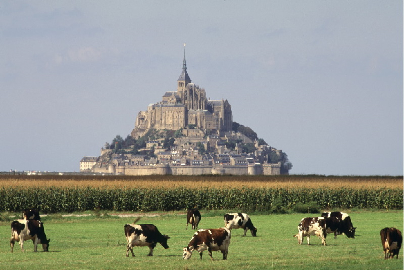 Die felsige Insel Mont-Saint-Michel im Ärmelkanal, etwa 1 Kilometer vor der Küste der Normandie entfernt. Auf dem Berg thront eine Benediktinerabtei.