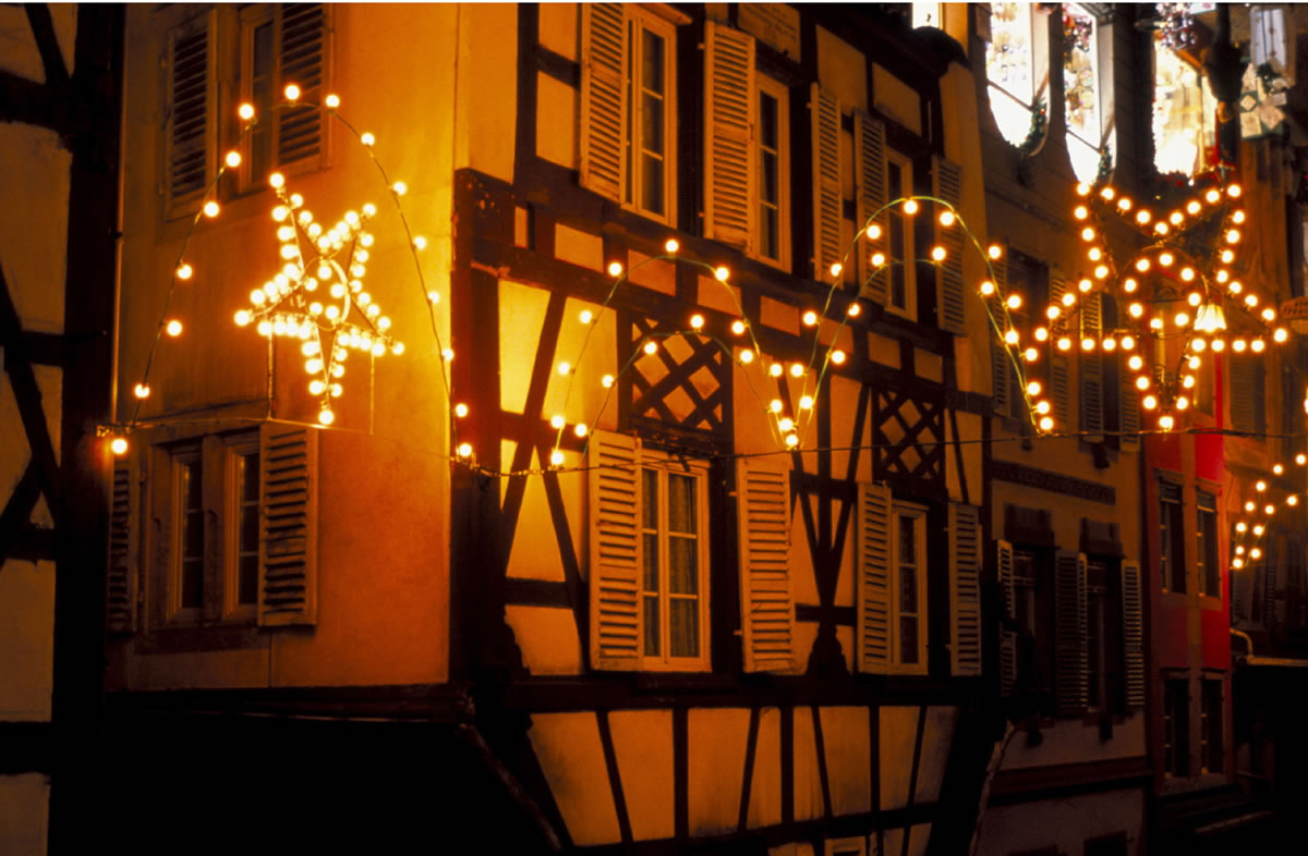 Eine schöne mit Lichtern und Weihnachtsschmuck behangene Straße in Colmar zur Weihnachtszeit in Frankreich