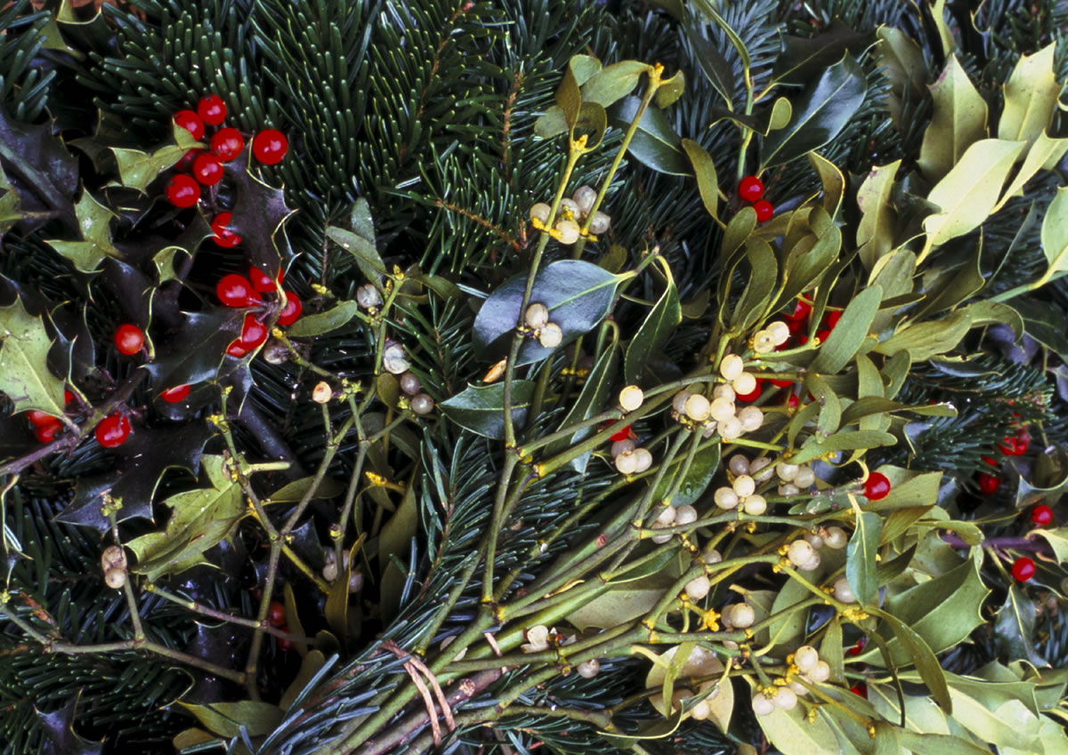 Mistelzweig und Stechpalme für Weihnachten. An Weihnachten ist es brauch jemanden der unter einem Mistelzweig steht zu küssen.