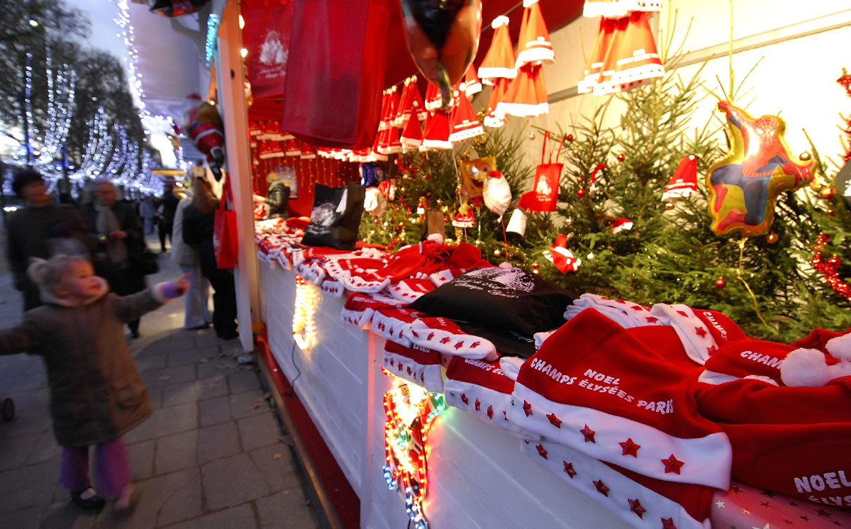 Die Beleuchtung und das die blickenden Weihnachtsmänner auf dem Champs−Elysées ziehen nicht nur kleine Kinder auf dem "marché de Noël" an.